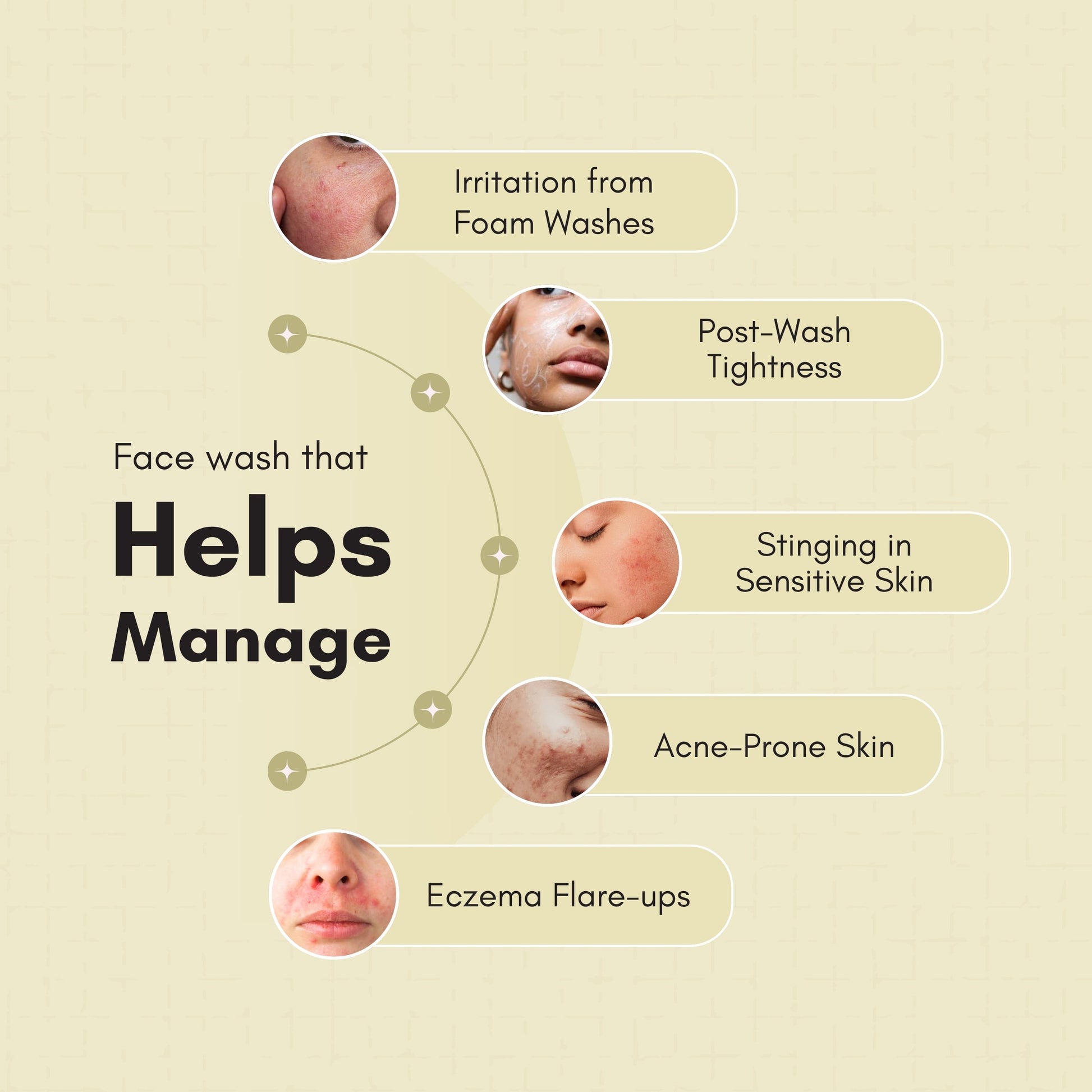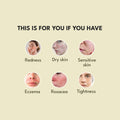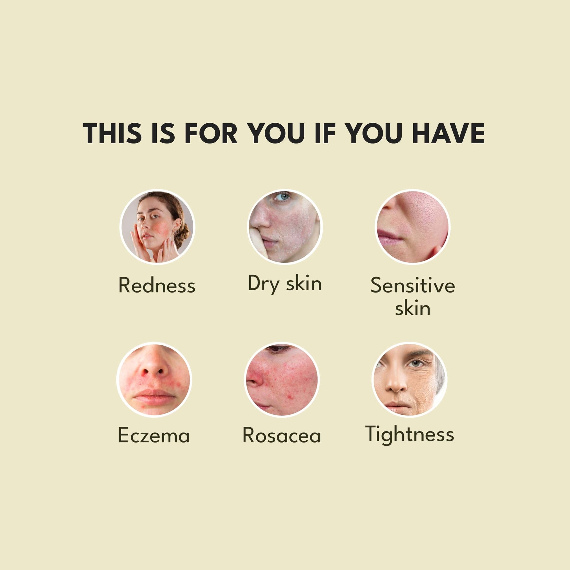 Redness, dry skin, sensitive skin, eczema, rosacea, tightness, itchy skin and acne.