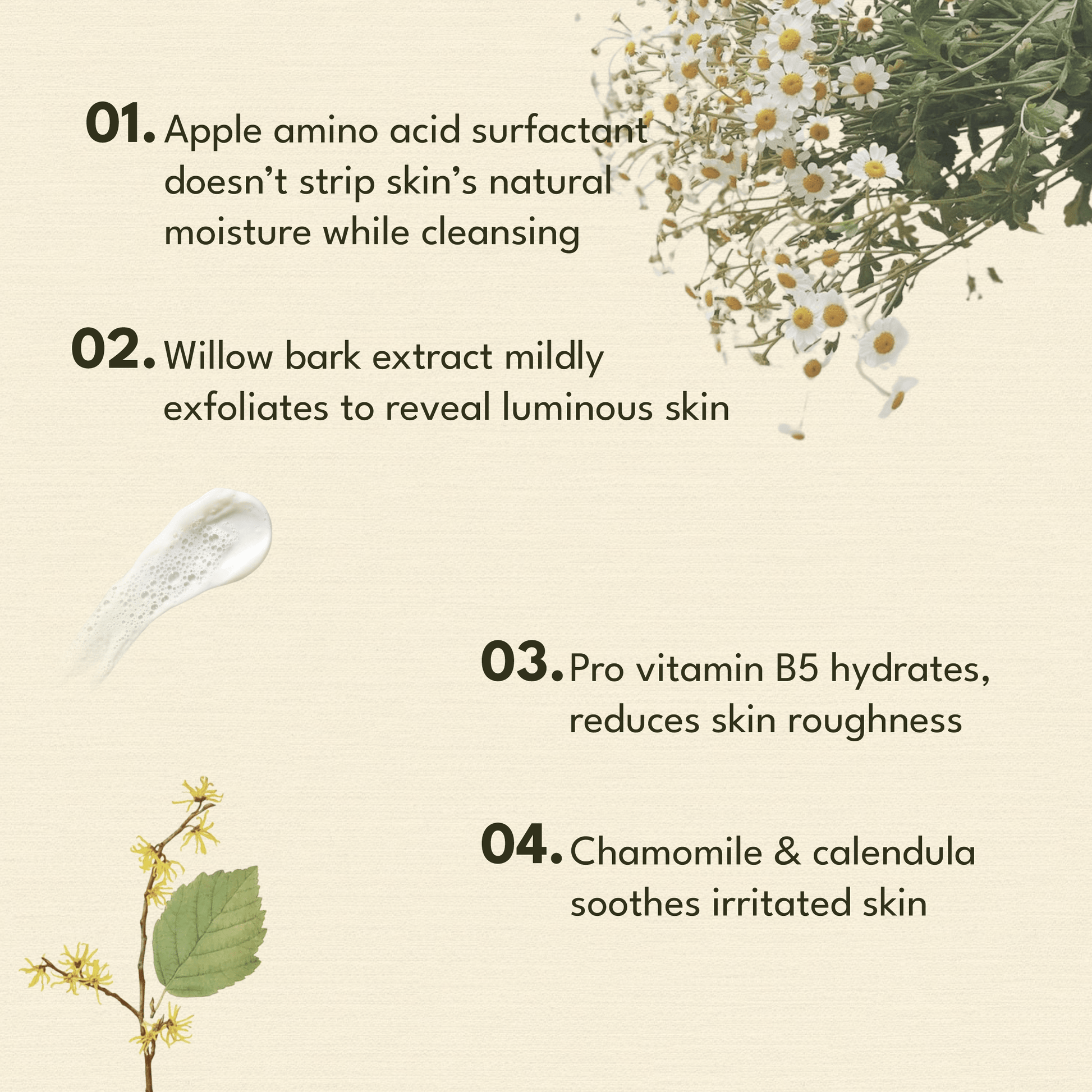 - White Willow Bark contains BHA, a natural exfoliant that helps remove dead skin cells without harsh abrasives, making it suitable for sensitive or acne-prone skin.