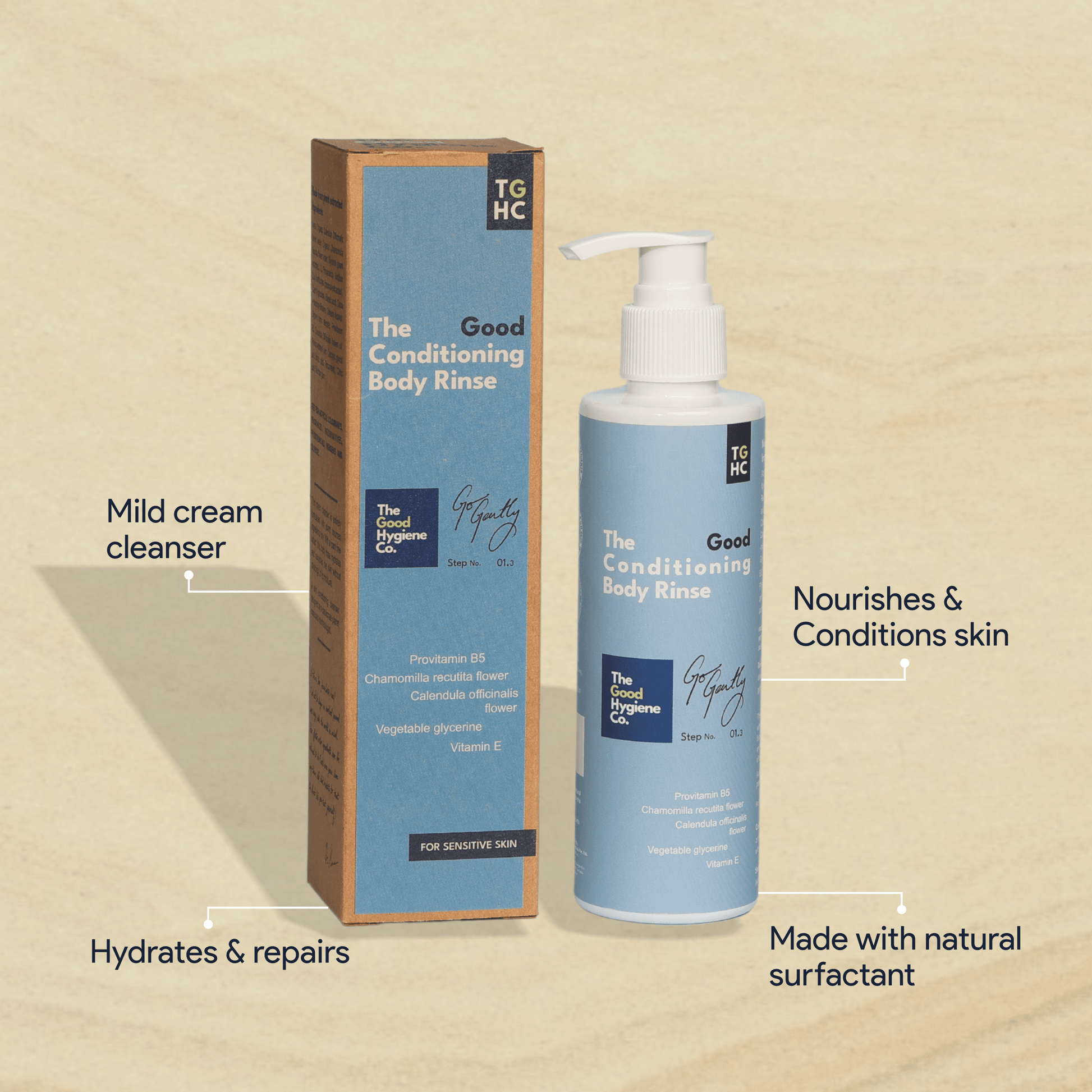 The good conditioning body rinse is specially formulated with soothing, plant based ingredient that doesn’t irritate dry sensitive skin, and free from harsh chemicals making it particularly gentle for sensitive and irritated skin. The surfactant used in the body rinse is coconut derived